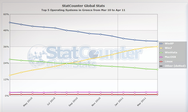 H Microsoft καταβάλλει μεγάλες προσπάθειες τον τελευταίο χρόνο, να «πείσει» τους πελάτες της να εγκαταλείψουν τα παλαιότερα λειτουργικά της συστήματα και να μεταβούν στην νέα της πλατφόρμα τα Windows 7. Συγκεκριμένα οι προσπάθειες στρέφονται προς τους χρήστες των Windows XP, του πιο επιτυχημένου λειτουργικού συστήματος της εταιρίας.Οι Έλληνες χρήστες, όμως δεν φαίνονται να συγκινούνται ιδιαίτερα. Σύμφωνα με τις μετρήσεις, το 40% των χρηστών στην Ελλάδα χρησιμοποιούν ακόμη τα XP. Το ποσοστό των 7, από την άλλη φτάνει στο 36%. Αν λάβουμε όμως υπόψη το γεγονός ότι τα XP φέτος κλείνουν τα 10 χρόνια το ποσοστό 40% δείχνει τεράστιο, μιας και μιλάμε για έναν τομέα όπου οι εξελίξεις τρέχουν ταχύτατα.